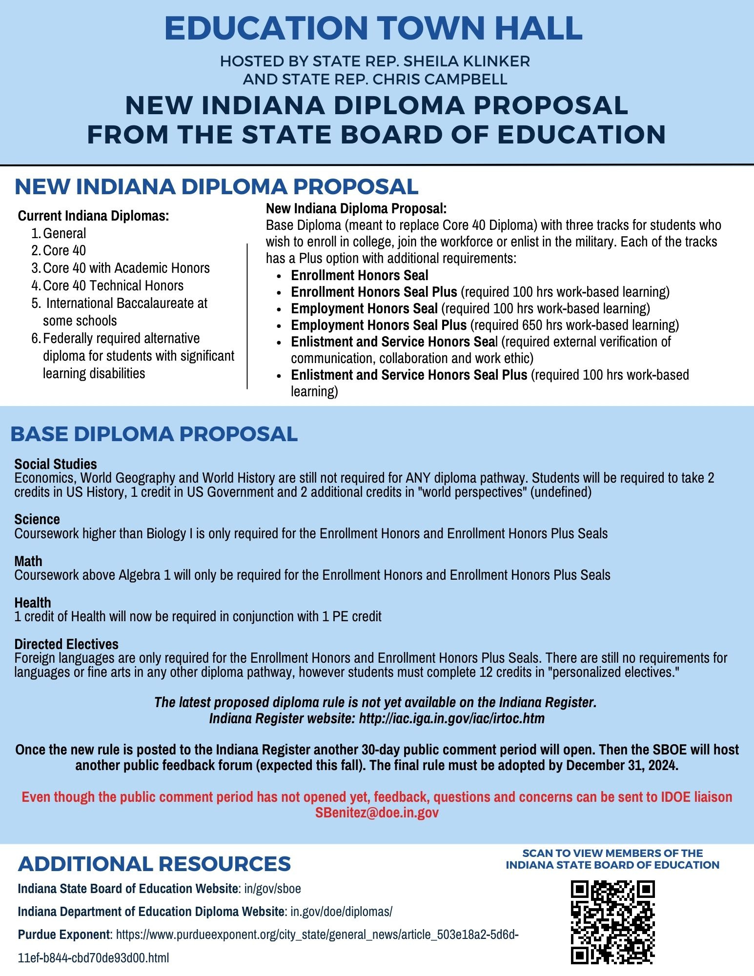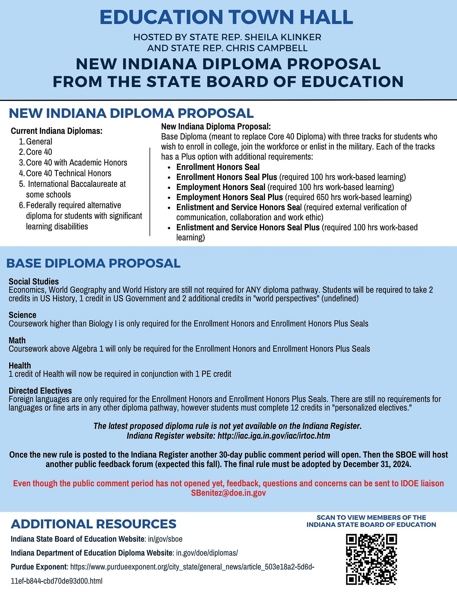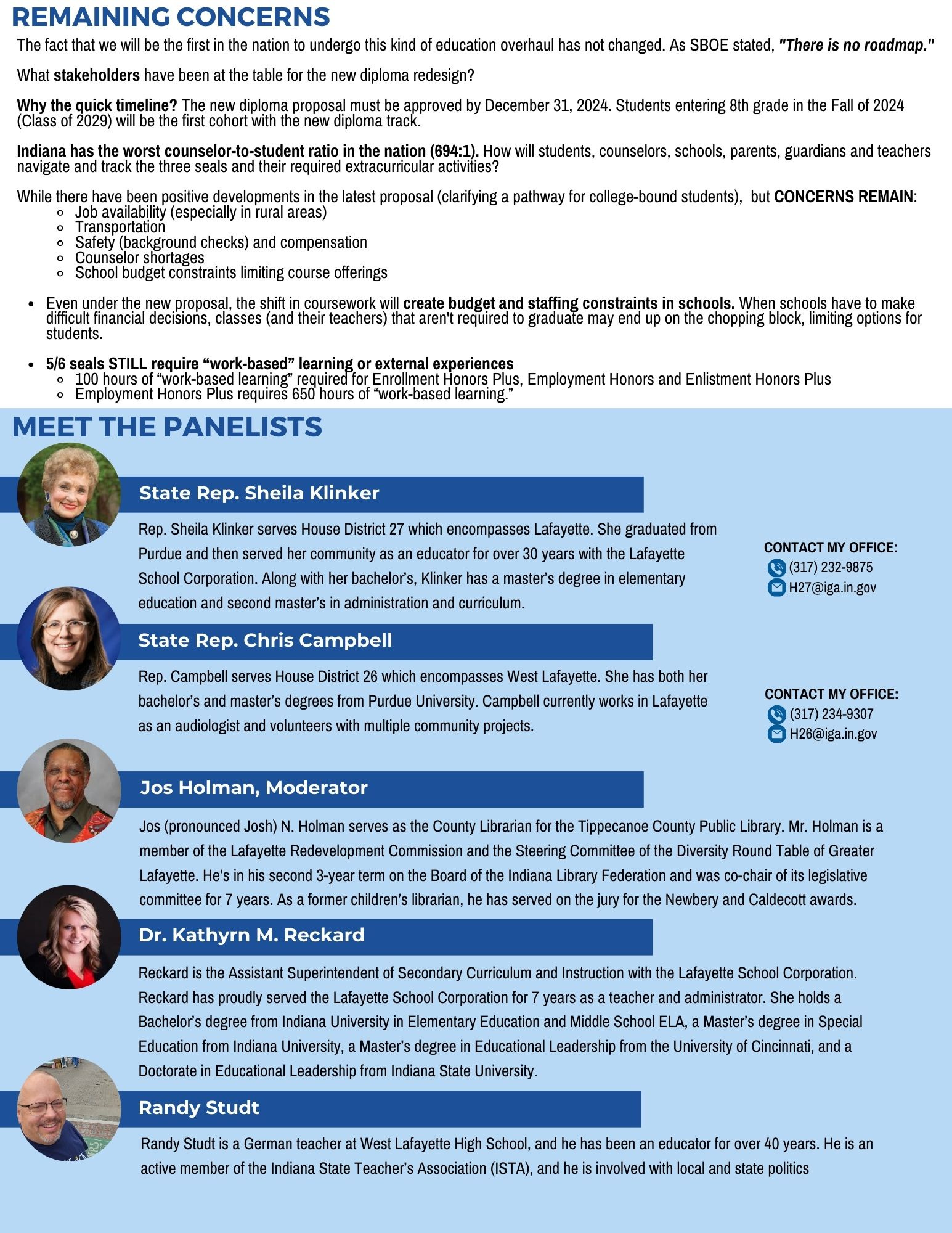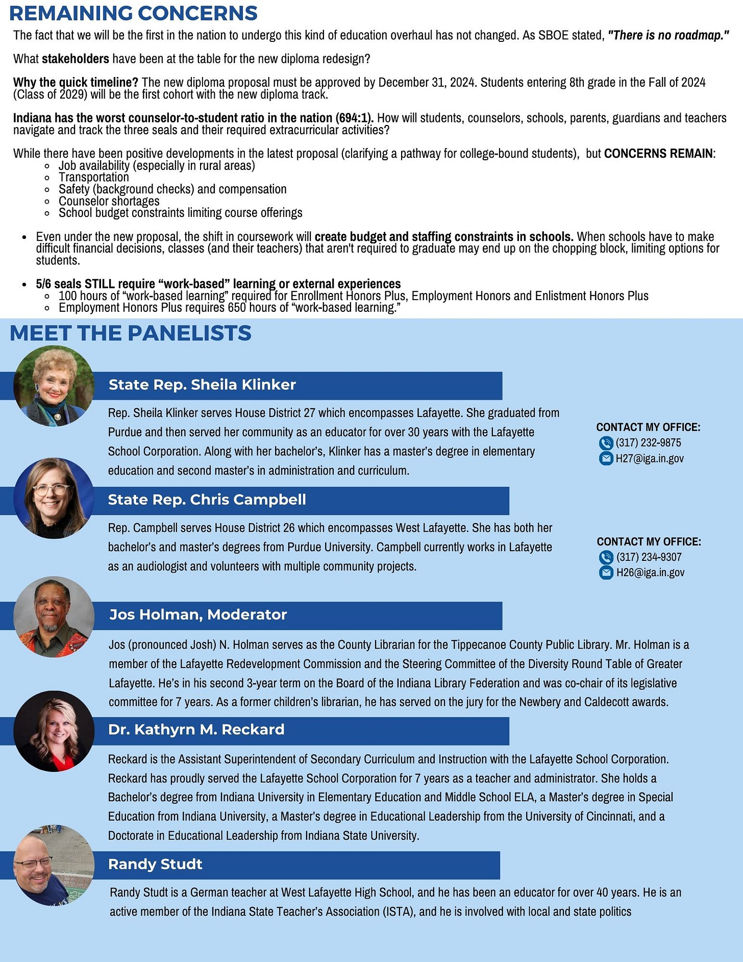 Last Tuesday (Sept. 24), State Rep. Sheila Klinker and I hosted an education town hall at the Jos N. Holman branch of the Tippecanoe County Public Library (TCPL). The town hall featured our moderator Jos Holman and our panelists, Randy Studt and Dr. Katie Reckard. The goal of the town hall was to discuss the second draft of Indiana’s high school diploma redesign. Our guests did an amazing job breaking down the base diploma, the six readiness seals and the remaining concerns from our educators.