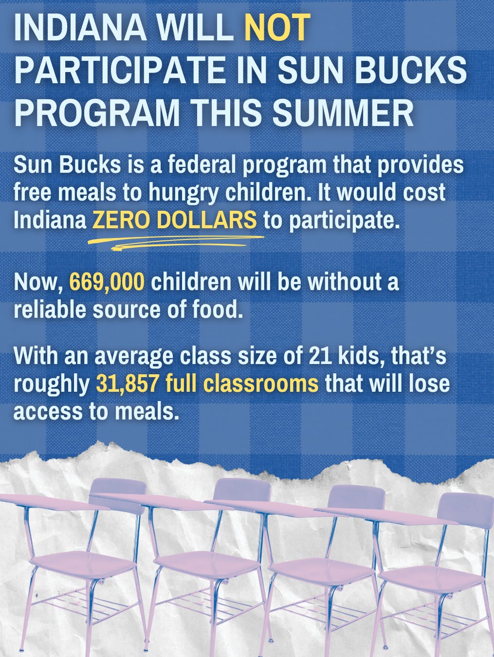 However, these children won’t get support this summer. Indiana opted out of the SUN Bucks program, even though it costs the state no money to participate. It’s unclear why the state opted out of this program. Thankfully, families can still get meals through the United States Department of Agriculture’s (USDA) food service locations. But eliminating the SUN Bucks program makes things hard for our families. Sometimes, rural areas only have one meal site per county. If you take a look at the nutrition map from the Indiana Department of Education, most meal sites are located around urban areas. Providing money to families directly gave them more flexibility so they’re not limited by grab-and-go meals, especially for children with allergies or severe dietary restrictions.